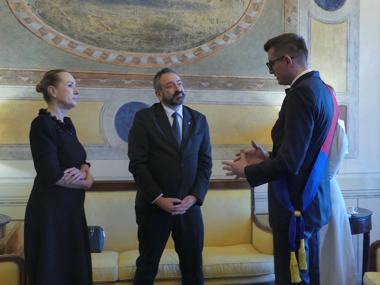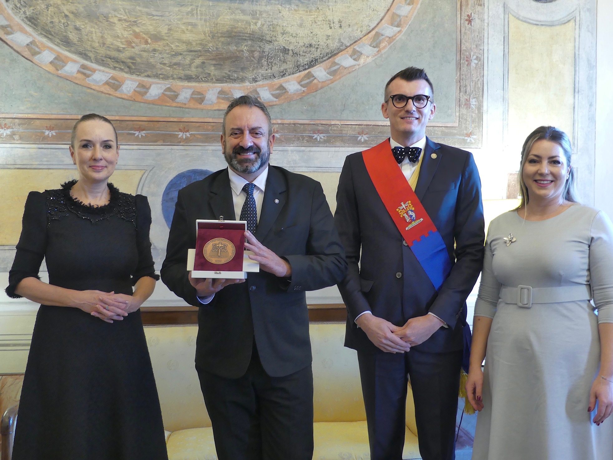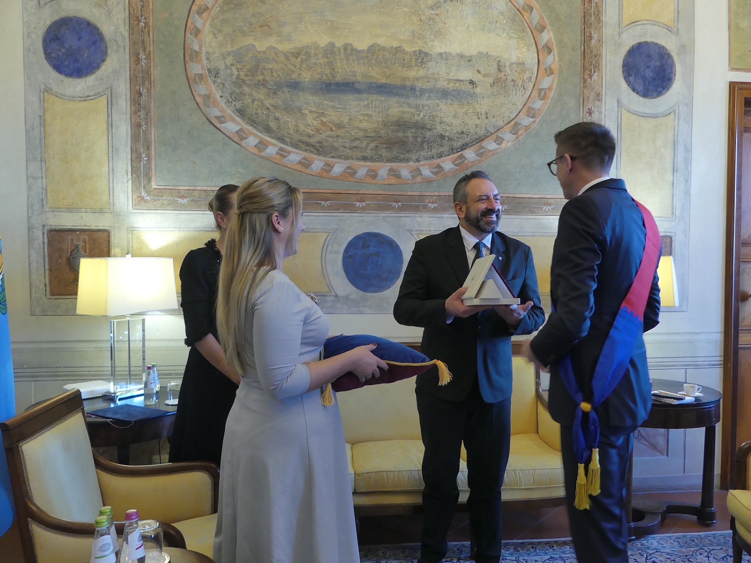 Città di San Marino, 10 December 2025. The Tree of Peace Memorial Plaque was presented at Palazzo Begni to the Minister of Foreign Affairs, Political Affairs, International Economic Cooperation and Digital Transition of the Republic of San Marino, His Excellency Luca Beccari, by the Slovak non-governmental and non-profit association Servare et Manere, in the presence of the Ambassador of the Slovak Republic, Her Excellency Karla Matiaško Wursterová, and a diplomatic delegation from the Sanmarinense Department of Foreign Affairs.